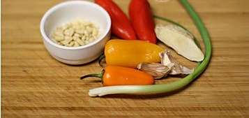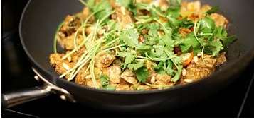 放入甜椒块翻炒一下,撒入松子、香菜段即可起锅。