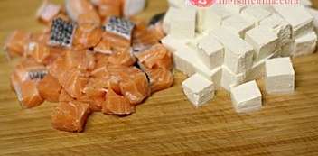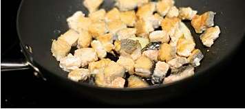 三文鱼去掉鱼骨,拔出鱼刺,和豆腐切成大小相仿的小块,并用厨房纸巾稍稍擦干水份,三文鱼块里撒入适量的黑胡椒粒,放入2勺面粉稍微裹以下;