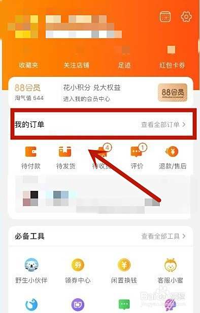 打开淘宝个人中心,点击我的订单,查看全部订单。