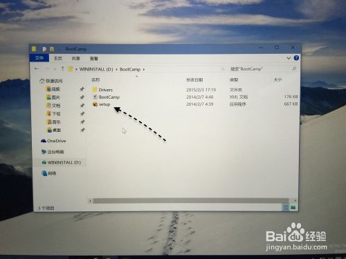 在安装好以后,请打开 U 盘启动盘,在 BootCamp 目录下,双击打开 Setup 安装程序,可以为 Windows10 安装 Mac 电脑的硬件驱动。