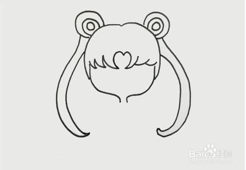 首先画出月亮公主前额的头发然后再画出头顶的两个团子,往下画出月亮公主的脸。月亮公主的头部就完成了。