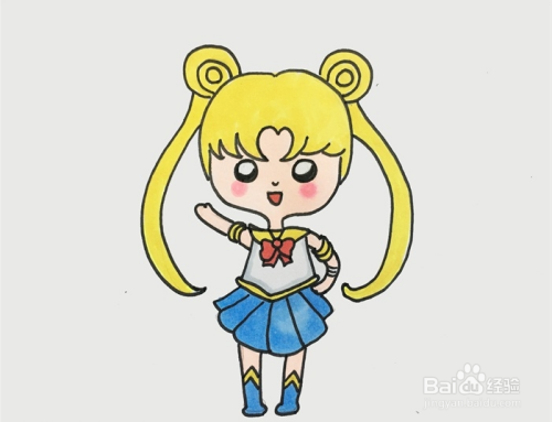 先画出月亮公主的头发,然后再画出头顶的两个团子,往下画出月亮公主的脸,接着画出身体,穿着水手服,一只手高高举起,给月亮公主的头发涂黄色,裙子涂蓝色,皮肤涂肤色,好看又简单的月亮公主就画好了。