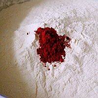 面粉中加入红曲粉混合均匀后、酵母用少许温水化开、慢慢倒入面粉中搅拌成雪花状