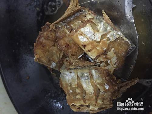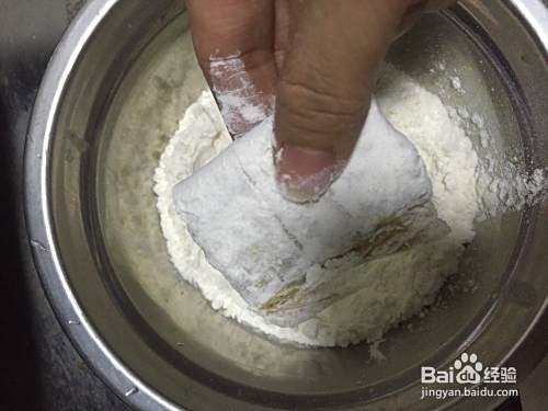 拿一个碗,倒一勺面粉进去,待用。把锅洗干净,倒油,开火,油快开了换最小火,再直接用手拿起腌过的带鱼,沾一沾面粉后放进油锅里,等全放完了,换大火。大火一分钟后,基本定型了,直接用铲子翻一翻。如图。
