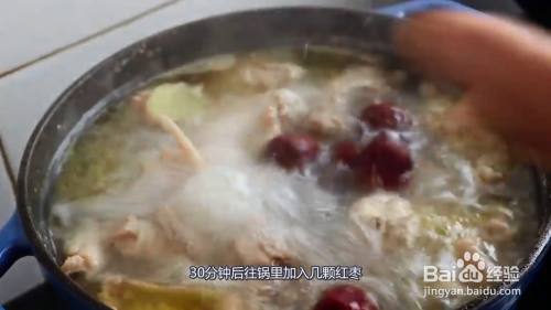 盖上锅盖用最小火炖30分钟,30分钟后往锅里加入几颗红枣,继续用最小火熬40分钟。