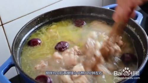 鸡块放入锅中,加入适量的配料小火炖30分钟,时间到后往锅中加入适量的红枣,小火熬40分钟,时间到后加入盐再煮10分钟即可出锅,具体方法如下: