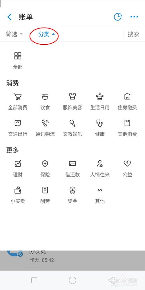 在账单页面,可以点击“分类”,这里分类比较详细,点击支付宝所支付或收入的内容就可以看到这类型的账单。