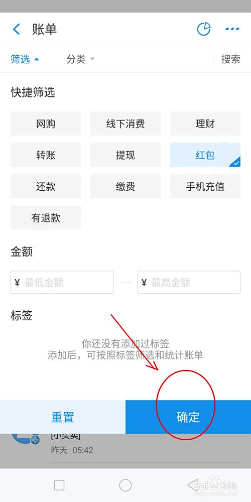 来选择查看账单的类型,选择“红包”并点击下方的“确定”。(如下图)