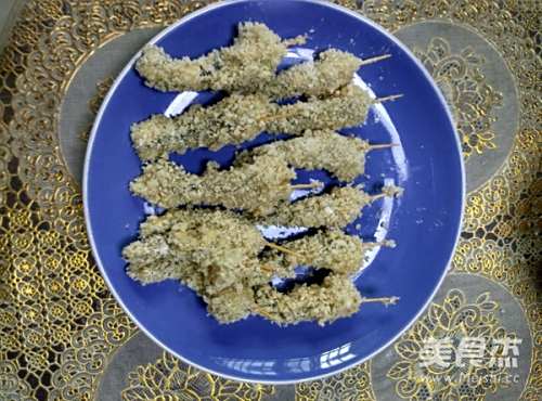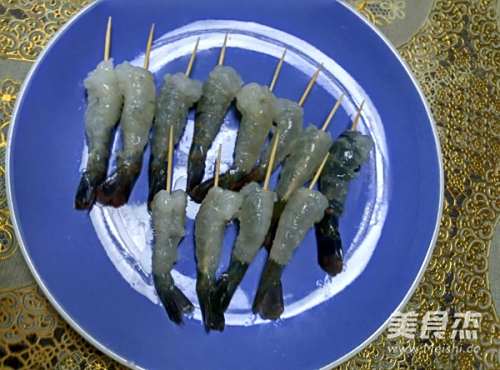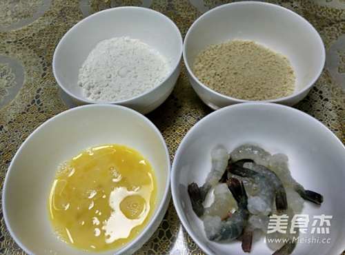 给虾依次裹上面粉,蛋液,面包糠,这张照片上的虾是刚处理好还没插牙签。^_^
