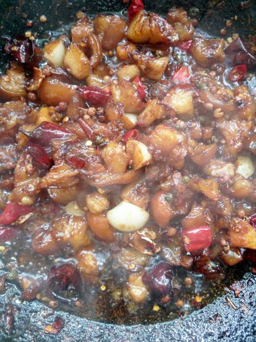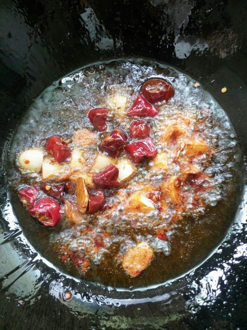 6然后再加入干海椒,姜,花椒炒香。不要炸太久,否则容易干