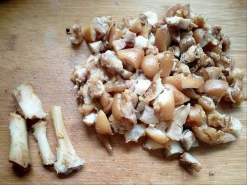 2冷却后让骨肉分离,将肉切成丁,骨头千万不要扔掉,加点辅料可以炖自己平时喜欢的骨头汤,我选择的是海带骨头汤,很鲜哦