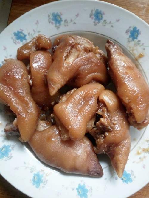 1我用的猪蹄是没有冻过的一整个新鲜猪蹄,店家会免费烙好后砍成小块,回家洗净后用自家卤将猪蹄小火卤半个小时,不要急于捞起来,在卤水汁里侵泡5-10小时都可以,我是侵泡了10个小时将卤水烧开后捞出猪蹄。