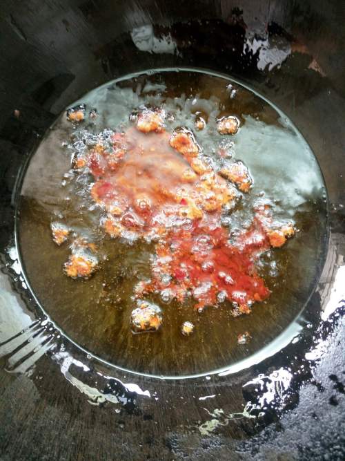 5倒入适量的油,冷油加适量的红糖(白糖)和豆瓣,炒至冒泡。