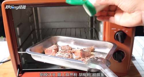 4去掉锡纸倒掉汁水,撒上孜然粉、胡椒粉、刷蜂蜜,230°C烤10分钟即可。
