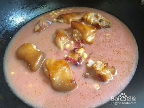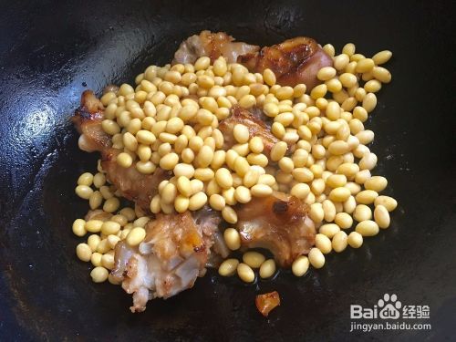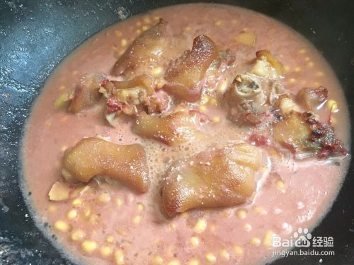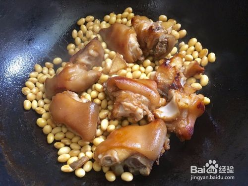 紧接着把沥干水分的黄豆倒进去翻炒,翻炒2分钟后就可以把红腐乳水倒进去,水量以快没过猪蹄为准,开大火烧开!