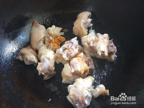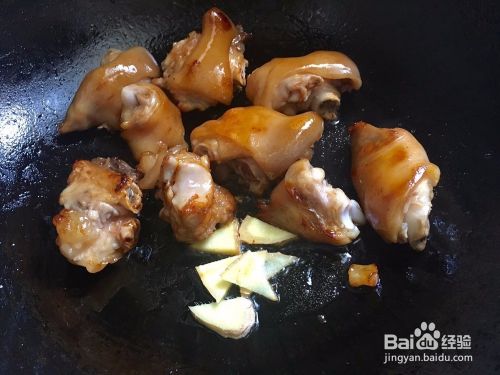 接着开火,锅烧热之后加入适量油,油热了之后把冰糖倒进去炒糖色,冰糖冒泡泡的是就可以把猪蹄倒进去翻炒,翻炒到猪蹄都上色后放入姜片!