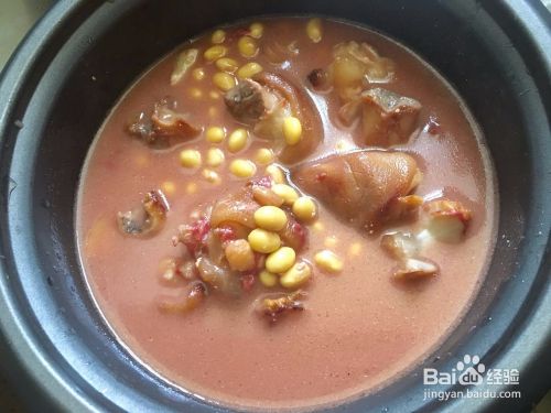 大火烧开之后可以换个过,倒在电炖过里,炖35分钟左右,待汤汁快干了猪蹄和黄豆也差不多软烂了!