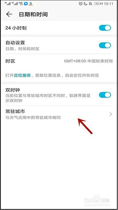 【4】打开“双时钟”右侧按钮,再点击“常驻城市”
