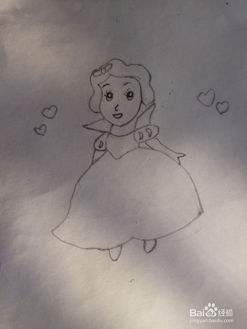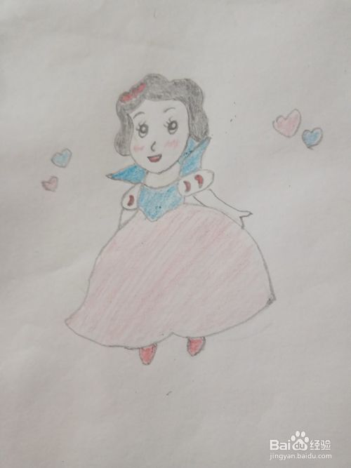 然后,画上公主的手臂和脚尖,再画衣服上装饰,这样可爱的白雪公主就画成了。