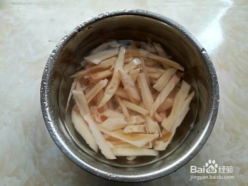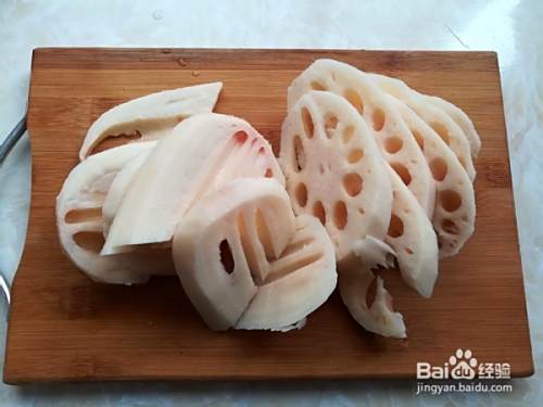 莲藕竖着对半切开,切成0.5厘米厚的薄片莲藕切成4-5厘米的长条,放入水里泡一下,防止莲藕氧化颜色变深