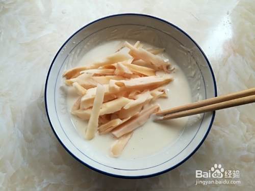 藕条沥一下水,分2-3次放入面浆中翻拌一下莲藕均匀地挂上面浆