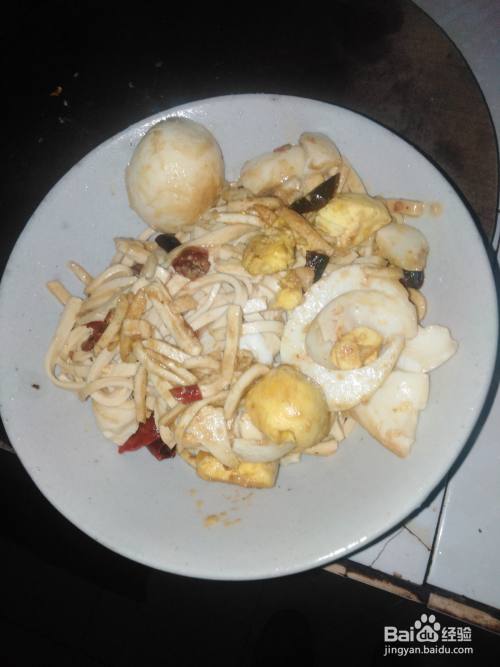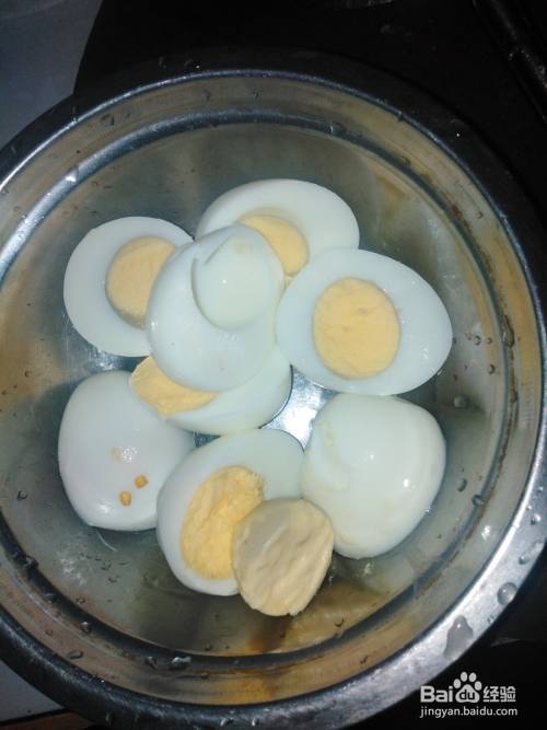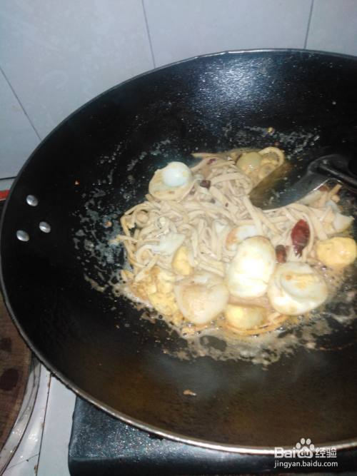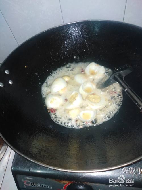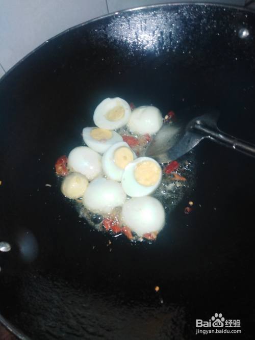 把煮熟的鸡蛋剥掉壳切成两半,再放入热油的锅中炸炒成微黄色再加入干辣椒段和盐一点料酒炒出香味。