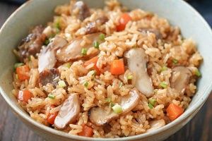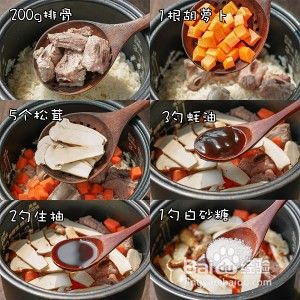 在电饭锅内胆周围抹上1勺猪油(刷猪油可以增加香气,没有的话也可以用其它油),倒入2小碗洗净的大米、200g排骨段、松茸、切好的胡萝卜丁,加入3勺蚝油、2勺生抽、1勺白砂糖。