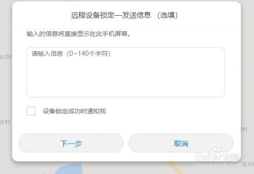 这时会弹出一个远程设备锁定发送消息窗口,在这里可以发送一条消息到我们的手机屏幕上,也可以不填写,直接点击下一步按钮。