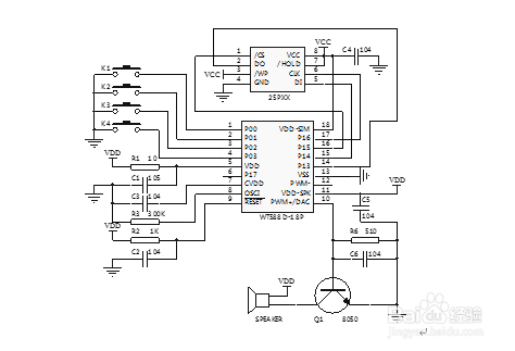 音频输出:DAC输出方式,利用NPN管将音频信号放大再输出给扬声器。R6为分流电阻,取值270Ω~1.2KΩ,阻值越大则输出声音越大。
