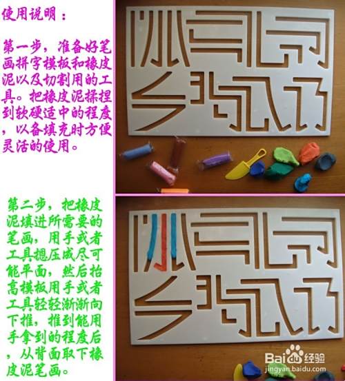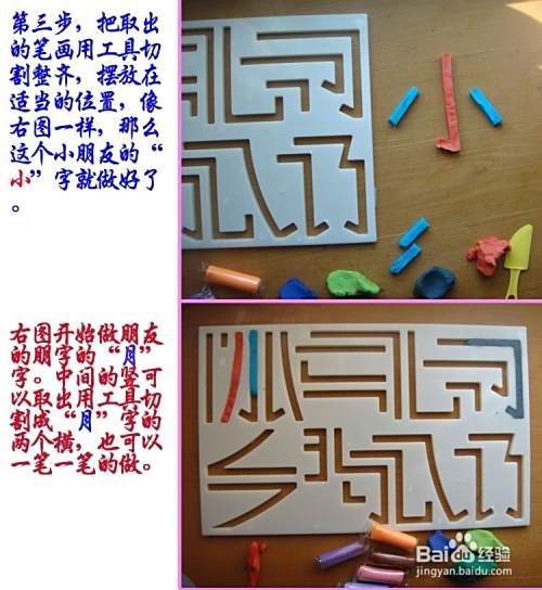 有一天,孩子又玩泥巴,我忽然想到一个让孩子既不影响嗨的心情,又可以让孩子学习的好主意。我找来一块厚厚的铺在地上做游戏用的塑料泡沫垫,用刀具刻出孩子的名字,让孩子装满泥巴,用手推出装满泥巴的字,但是不容易完整的取出来。我想了很久解决这个问题的办法,最后决定还是一步一步的做,我只在泡沫垫上镂空出孩子名字所用的几个笔画,教孩子一笔一笔的拼出自己的名字,笔画交叉处我用随手捡起的树枝条挤压出凹槽,使交叉处衔接的很好。终于还是拼出孩子的名字了,做好后,我把所有的泥巴又捏在一起重做。可能是孩子感兴趣的原因,我只教了孩子三四遍,孩子居然能自己拼自己的名字了,尽管我在孩子旁边给他做笔画交叉处的衔接。当时的情景是,我发自内心的满足,孩子也乐在其中。就这样,我的笔画拼字模板雏形出来了。现在我把这个自己的作品放到淘宝上让大家共享。