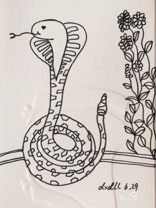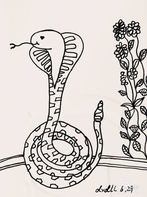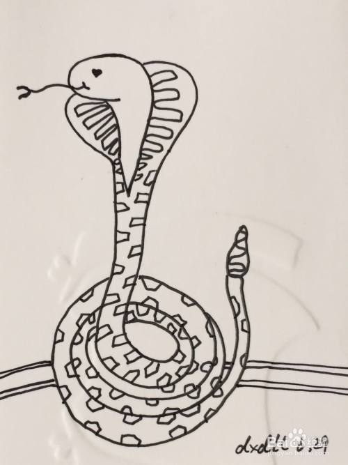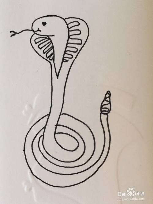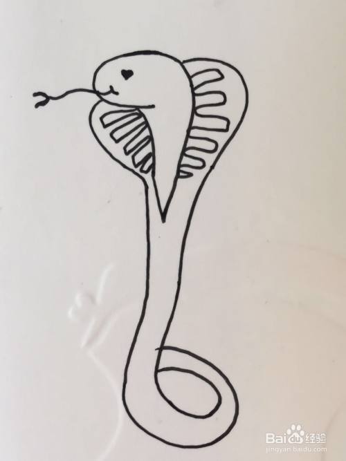 我们用笔画出眼镜王蛇的舌头,在其头部两侧画出蛇的身体。画法可参见如下图所示。
