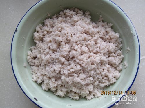 莲菜洗净擦丝,然后放在案板上再剁几下,剁好放入盆中。