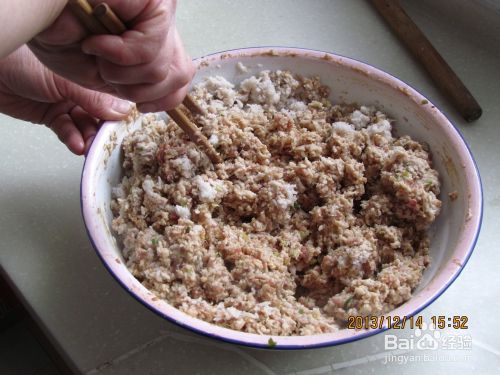 搅拌肉馅的时候要顺着一个方向搅拌,这样拌出的肉馅有劲,吃起来更香,搅拌时间要长一些。