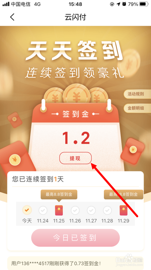 进入【签到】页面就可以看到自己的签到金,点击【提现】。