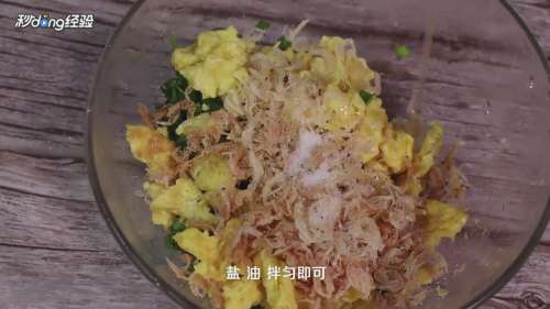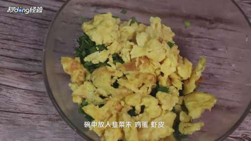 碗中放入韭菜末、鸡蛋、虾皮、盐、油。