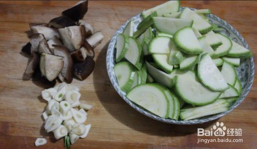 西葫芦切片、香菇切块、蒜切片。