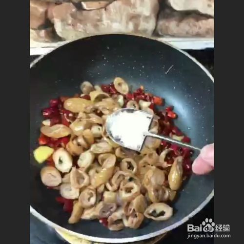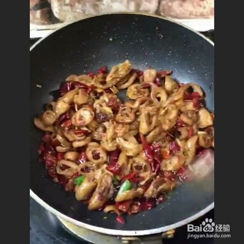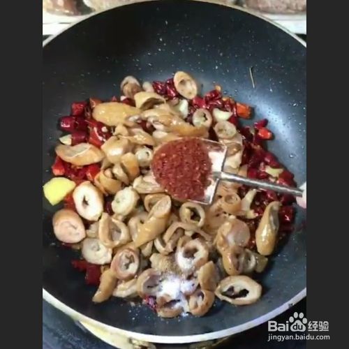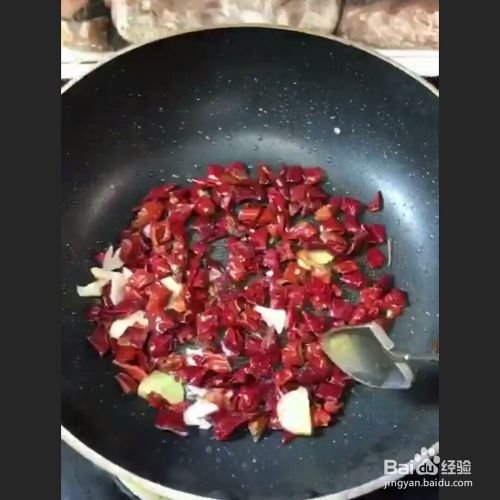 锅里留底油,倒入葱姜,干辣椒爆香。