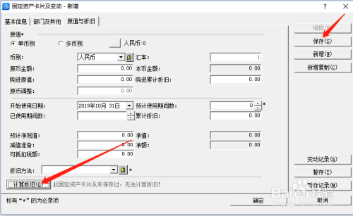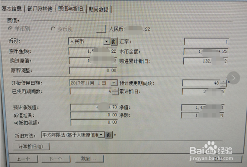 “部门及其他”模块填写完毕,点击“原值与折旧”模块,依次填写金额、原值、累计折旧、使用日期、预计净残值等,填写完毕,点击下方“计提折旧”,点击右侧“保存”,至此固定资产增加完毕