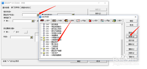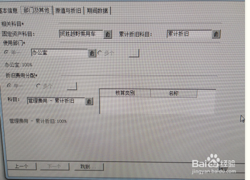 依次填写完基本信息(标有*的为必录项),接着填写“部门及其他”:点击固定资产科目右侧,选择会计科目-“固定资产”再点击右侧“新增”,根据资产类别增加二级科目