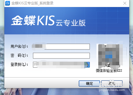 首先,打开“金蝶KIS专业版”,输入用户名,选择相应的账套,输入密码,点击确定登录进入账套