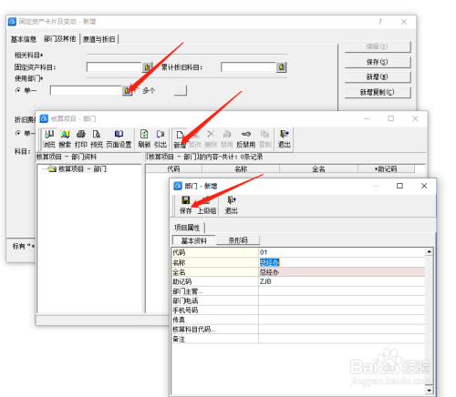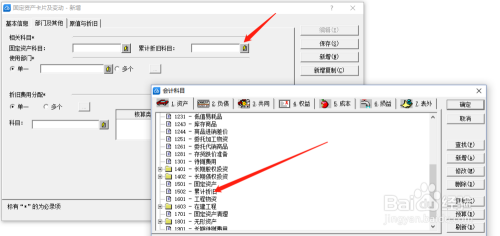 然后点击累计折旧科目右侧,点击选择“累计折旧”科目;点击使用部门,下设新增使用部门,点击保存;接着选择下方折旧费用分配科目-选择管理费用,下设二级科目“累计折旧”