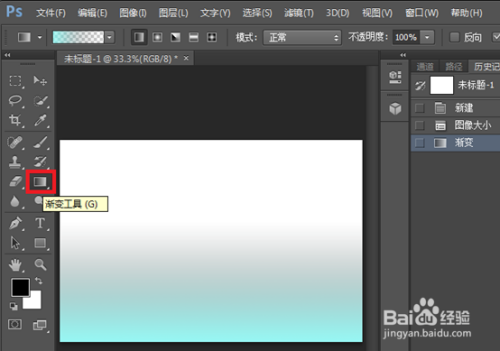 1.启动PS,新建一个白底背景层,在上面填充渐变,如下图所示;
