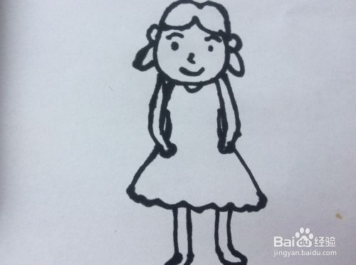 在小女孩身体的下方画出小女孩的两条腿。小女孩的简笔画就完成啦!
