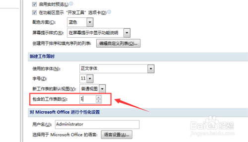 然后在里面点击包含的工作表数后面的上下箭头,将数量调整成1.