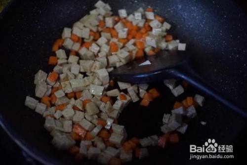锅里热油后放入切好的胡萝卜丁翻炒,胡萝卜炒5成熟后放入切丁的肉饼翻炒,肉饼翻炒出香味倒入甜玉米粒翻炒均匀
