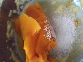 南瓜去皮,切片,放入蒸锅中蒸熟,加入白糖和酵母,搅拌均匀。