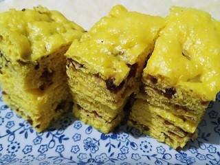 南瓜泥、面粉、白糖和酵母混合,搅拌均匀,擀成面片,撒上红枣,折三折,再次擀成薄片,撒上红枣,折三折,放入蒸锅中,蒸熟。