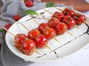 做好的山楂串放到抹了油的盘子里几分钟就变硬了,薄薄一层糖特别酥脆