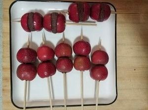 取一团豆沙夹在中间,用竹签穿好,不要穿太多个,蘸糖的时候不好操作