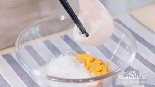 在红薯泥中加入普通面粉,再加入玉米面、酵母。搅拌成糊。